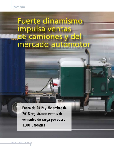 Mercado Fuerte dinamismo impulsa ventas de camiones y del mercado automotor Enero de 2019 y diciembre de 2018 registraron ventas de vehículos de carga por sobre 1.300 unidades Revista del Camionero 10