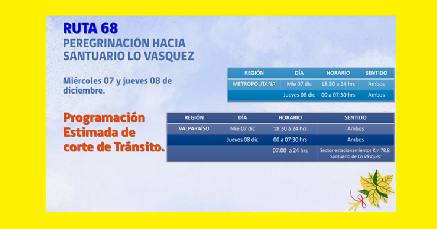 La mayor complejidad para el inter feriado del 8 de diciembre será el corte total de la Ruta 68 Santiago – Valparaíso por la peregrinación al santuario de Lo Vásquez, con motivo de la fiesta religiosa de la Inmaculada Concepción.