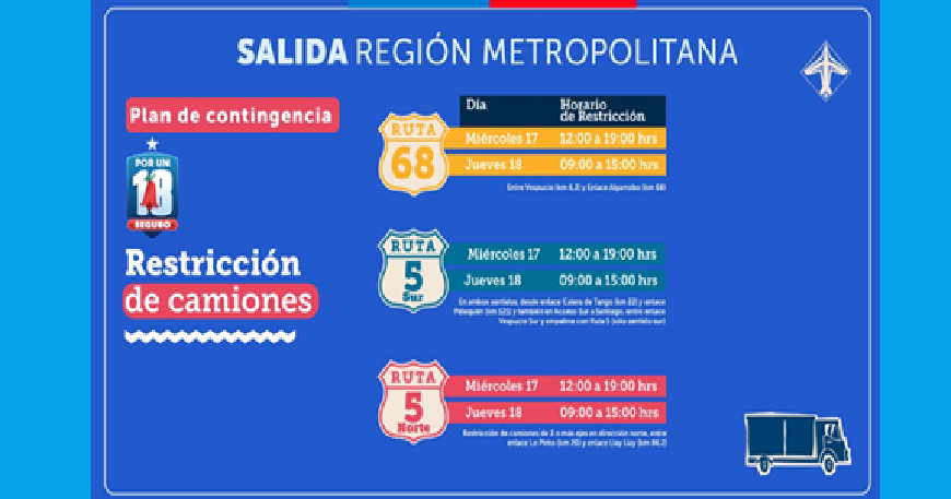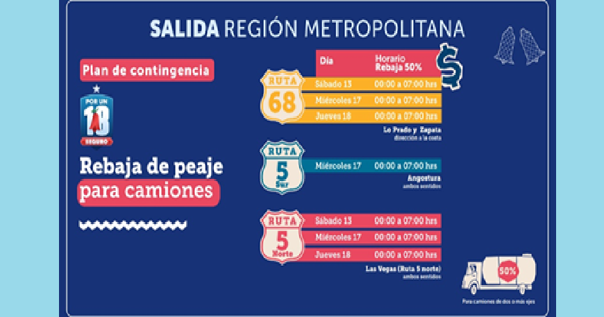 El MOP informó que habrá peaje rebajado en 50% para camiones de 2 o más ejes entre las 00:00 y 07:00 horas, el sábado 13 en la Ruta 68 (Lo Prado y Zapata) y Ruta 5 Norte (Las Vegas). La medida se repetirá, en el mismo horario, el miércoles 17 y jueves 18 en la Ruta 68, Ruta 5 Norte y Ruta 5 Sur.