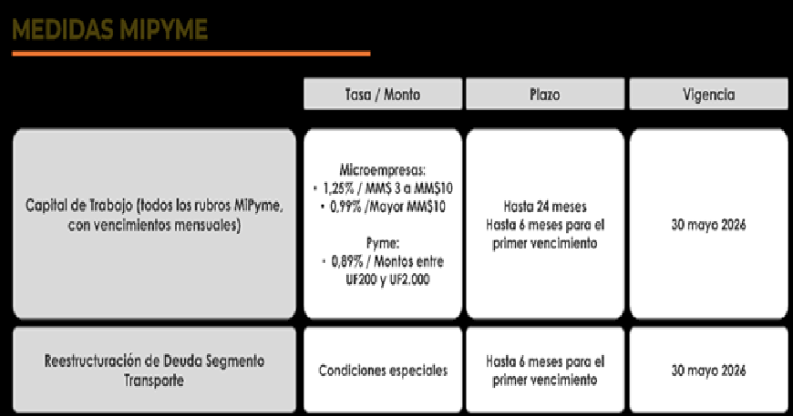 Se trata de la campaña “Chile no se detiene, nuestro Banco tampoco”, que según carta dirigida por el gerente de MiPymes, Emilio Vélez, otorgará préstamos en condiciones preferenciales y con plazo de hasta 24 meses y de 6 meses para el primer vencimiento. Lo anterior, tanto para capital de trabajo como para reestructurar deudas.