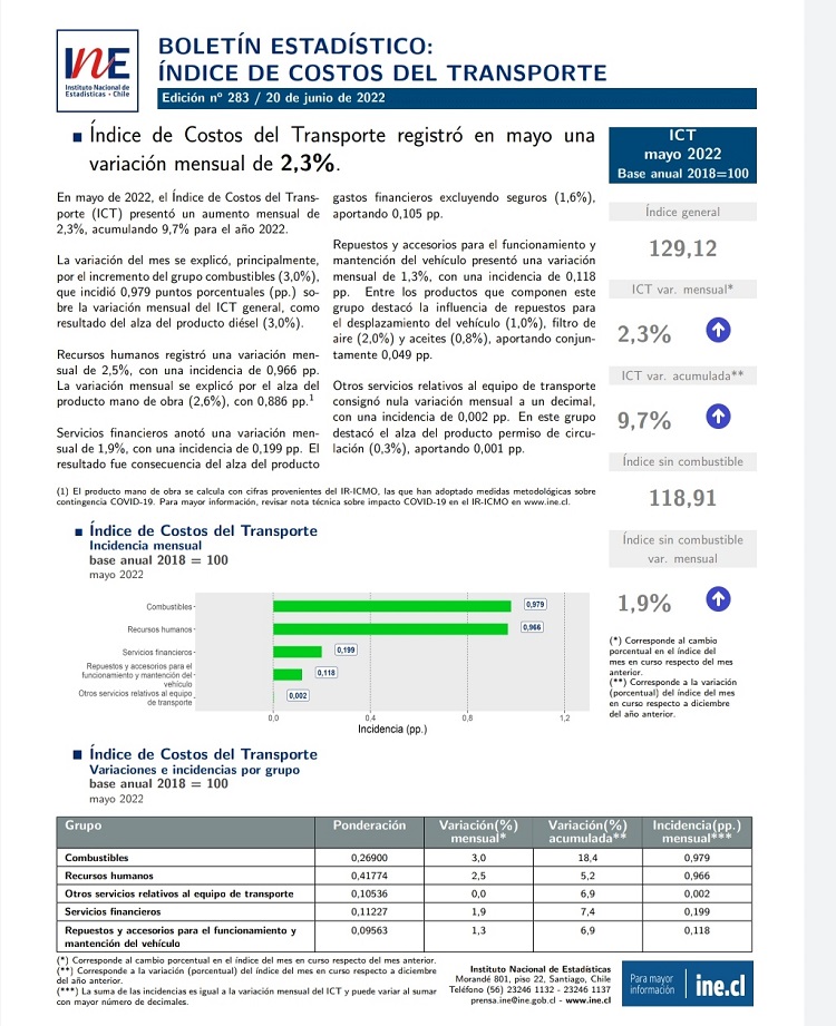 El INE determinó que el alza del grupo Combustibles en mayo representó casi la mitad de todo el ICT. Sin embargo, no es menor que los otros grupos también muestran aumentos: recursos humanos, servicios financieros, y, repuestos y accesorios para el funcionamiento de los camiones. La tendencia de este último grupo debe alertar a los operadores porque, al igual que los combustibles, se trata de productos y bienes importados, y por lo tanto sometidos a las fuertes alteraciones que tiene el tipo de cambio.