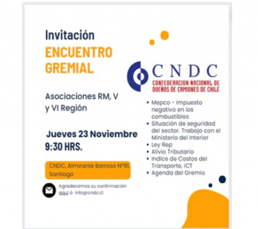 Este próximo jueves 23 de noviembre la Confederación de Dueños de Camiones de Chile realizará una asamblea gremial convocada para las asociaciones de las regiones Metropolitana, Quinta y Sexta y que tendrá lugar en la sede de la institución.